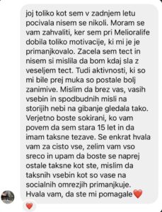 Za vadbo z utežmi so spodbujali predvsem moške, kar je ženskam otežilo, da bi v rekreaciji našle večji pomen od zgolj estetskih ciljev. Zato sta skupaj s Tinkaro ustvarili Meliora Life studio, kjer ženske dobijo vse znanstveno podprte informacije o vadbi z bremeni, za ženske z dolgoročno vizijo ohranjanja vitalnosti in zdravja.