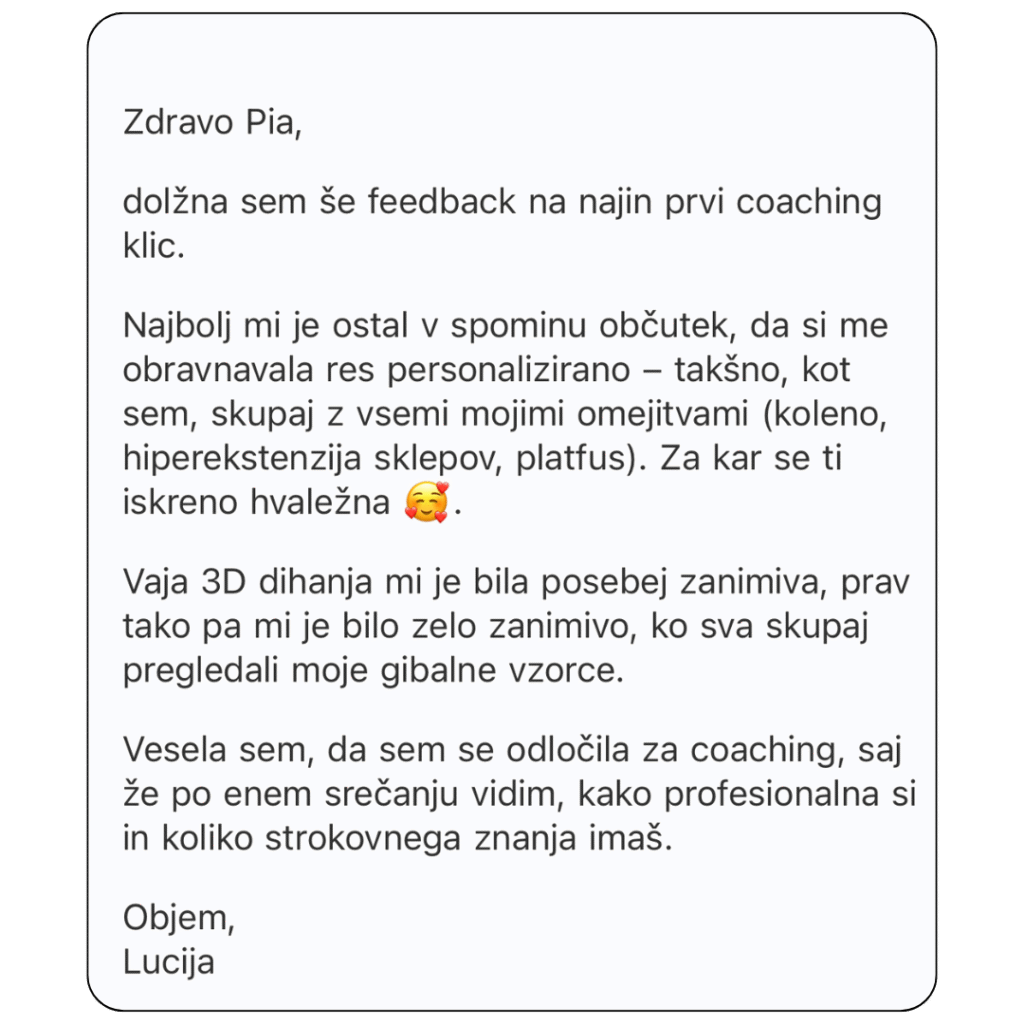 Zoom vadbe potekajo vsak ponedeljek ob 19.00 in so namenjene vadbi za moč s poudarkom na pravilni izvedbi vaj. Treningi so zasnovani tako, da skozi prakso razvijaš boljši nadzor gibanja, razumevanje dihanja in večjo zanesljivost v izvedbi vaj.