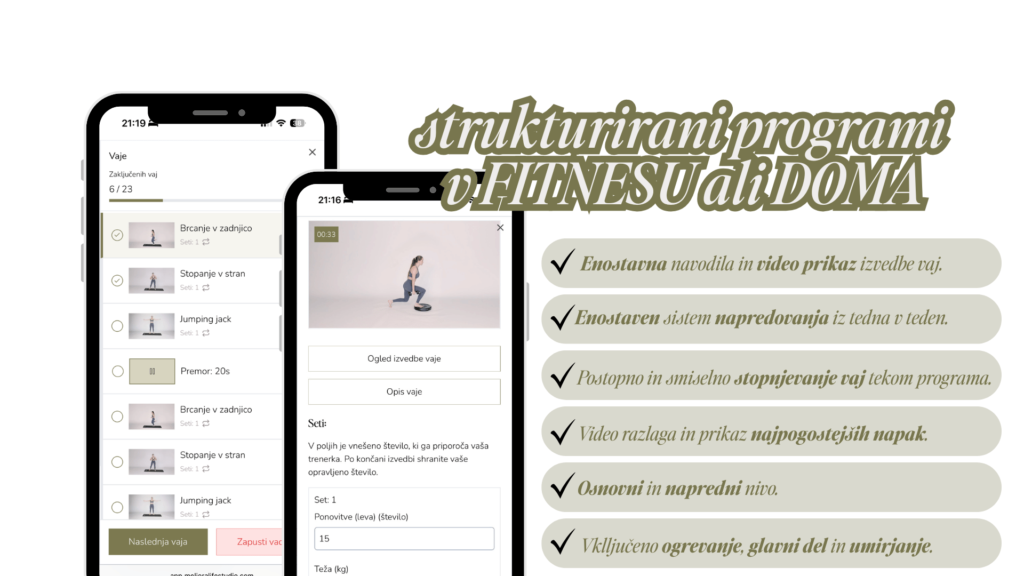 Namesto naključnih vaj dobiš strokovno vodenje, jasen načrt in podporo, da tvoje telo res napreduje.
