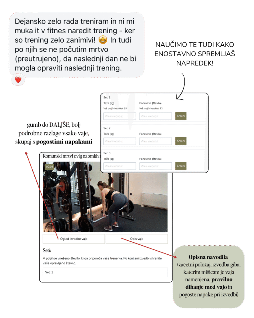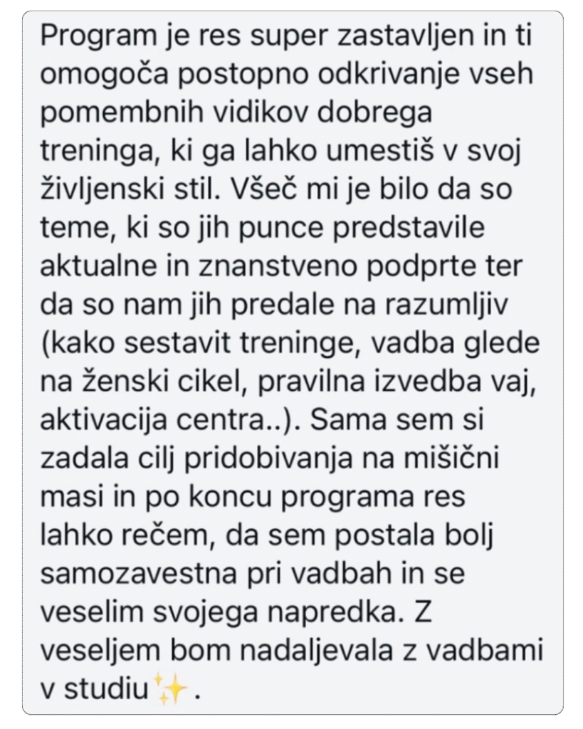 Po 2 mesecih boš imela znanje, strukturo in samozavest za trening in prehrano, ki podpirata tvoje zdravje ter vodita do manj maščobe, več mišic in boljšega počutja v telesu.